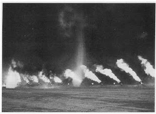 Затем число метеотронов было увеличено до сорока. Возникший гигантский огненный столб сопровождался черным облаком, по размерам не уступавшим облаку нефтяного пожара в Калифорнии. Искусственный нефтяной пожар по размерам пламени и облака не уступал естественному. Результаты сказались сразу: дымовое облако под влиянием небольшого ветра наклонилось так же, как это происходило в Калифорнии и при извержениях. Из подветренной стороны облака сначала свесились короткие и небольшие воронки, но скоро они достигли земли, образовав настоящий смерч.