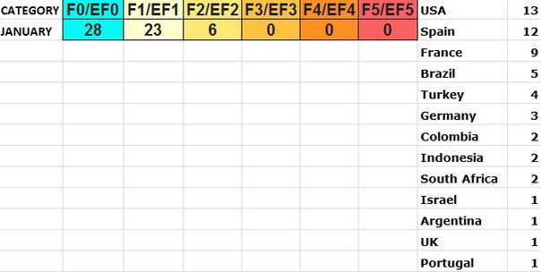 В течение первого месяца 2018 года в мире было зафиксировано 57 смерчей, шесть из которых были значительными. Больше половины смерчей были связаны с семи вспышками торнадо. Большая часть смерчей была зарегистрирована в Европе, а не в США.
