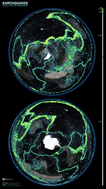 На этой карте, на самом деле, очень хорошо отражаются тектонические плиты (картинку вставили после). И по яркости можно понять, насколько много и какой силы землетрясения были.