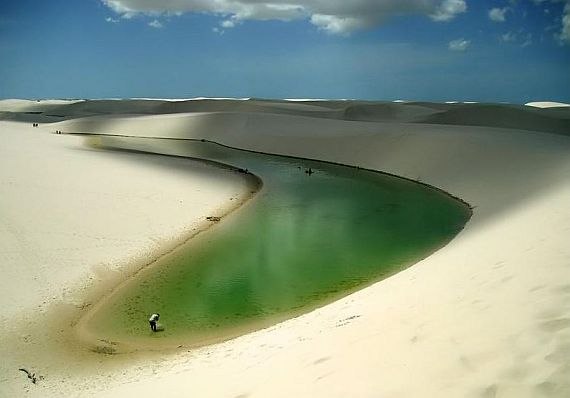 Простыни Мараньяна находятся в Бразилии, штат Мараньян, в Национальном парке Lencois Maranhenses. Парк с огромными песчаными дюнами высотой до 40 метров, белые пески занимают примерно тысячу квадратных километров. Уникально это место тем что пустыня наполовину наполнена пресной водой.